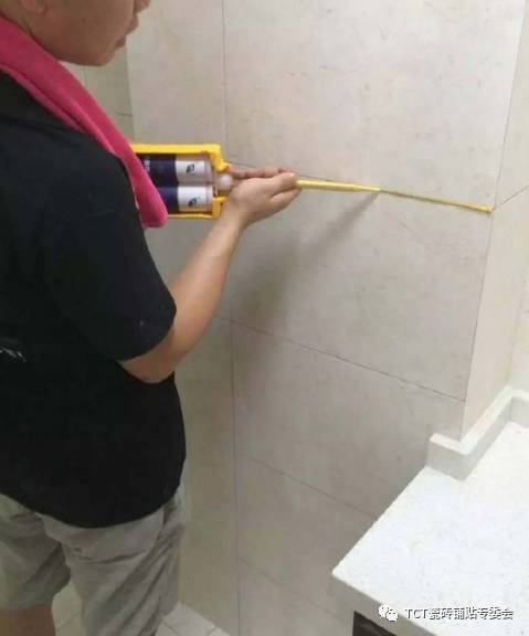 在使用胶枪往缝隙中打美缝剂的时候一次不要打太长。美缝剂是一种速干产品,对于新手来说一次打20-30公分就可以了。有很多刚入行的美缝师不清楚状况,一次打很长,之后来不及处理就凝固了,一但凝固后再擦就相当的麻烦了。